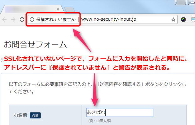Chromeをご利用の場合、現在はSSL化されていないページにフォームがあった時、そのフォームに何か入力を始めるとアドレスバーに「保護されていません」との警告が表示されます。