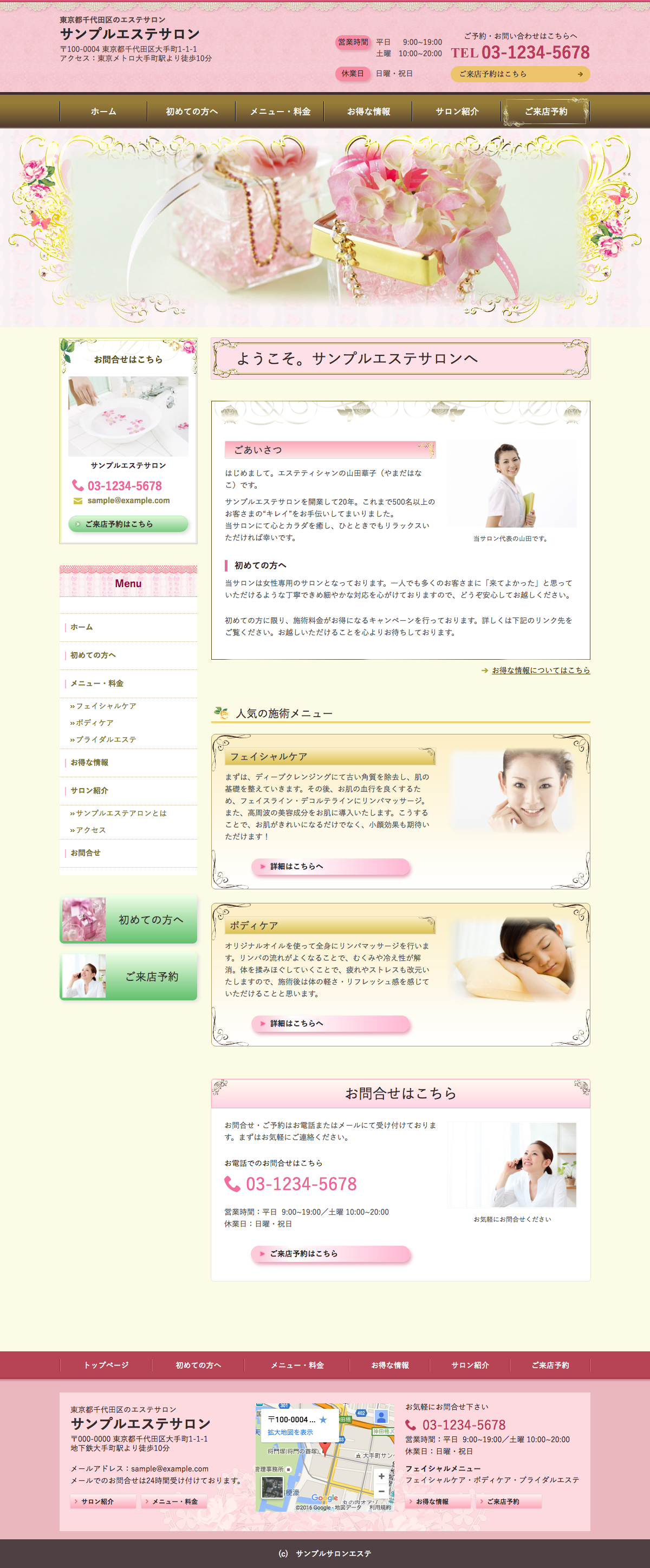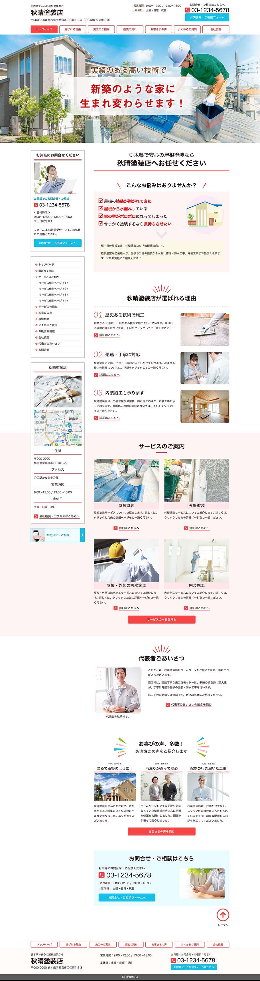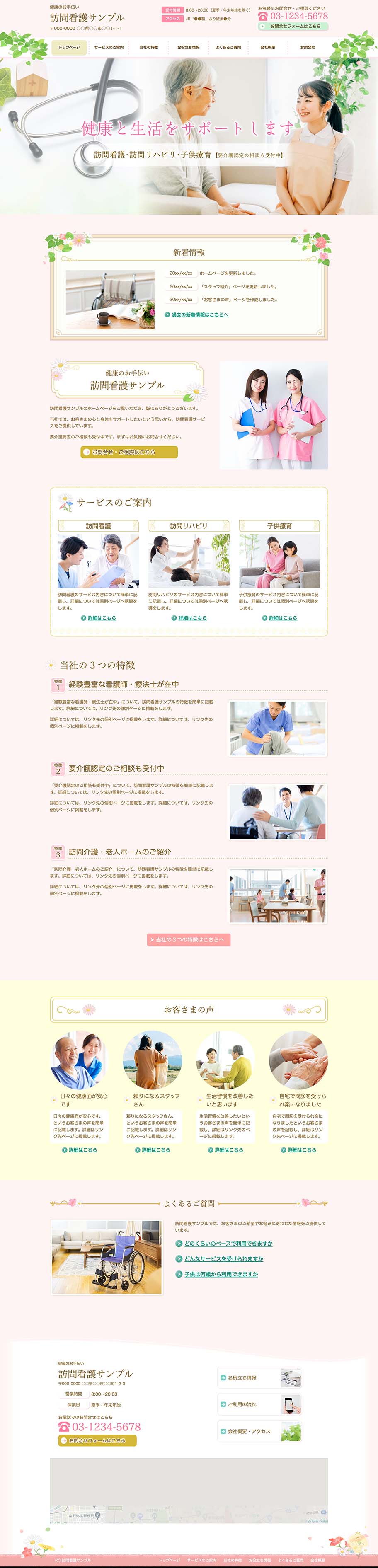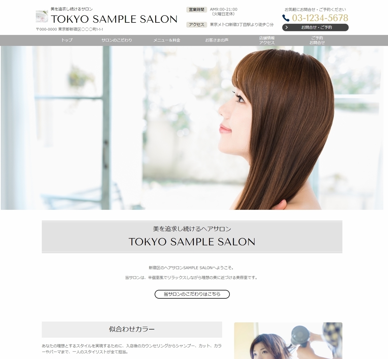 ※サンプルにより、トップページのサイドメニューの有無、色味や装飾(見出しやアイコンの形)などを変更できない場合がございます。 あらかじめご了承ください。